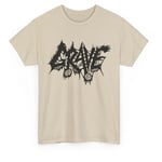 This logo T-shirt features authentic demo-era artwork from Grave, one of the foundational bands responsible for defining the weight and atmosphere of early Swedish death metal. Known for their crushing low-end and uncompromising early recordings, this design preserves the stark visual identity that accompanied Grave’s formative demo period.