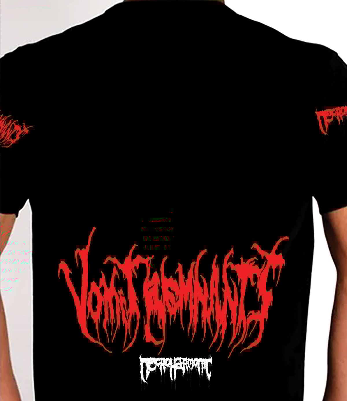 Necroharmonic presents an exclusive 2026 Vomit Remnants short sleeve shirt featuring a large front band logo and corpse illustration, a back bottom logo, and prints on both short sleeves. The left sleeve displays repeating Vomit Remnants logos while the right sleeve features repeating Necroharmonic prints, creating a classic underground death metal merchandise layout adapted to a short sleeve design. Printed on black garments with red and white ink, this shirt is designed in the tradition of classic brutal death metal merch with strong contrast and bold artwork.